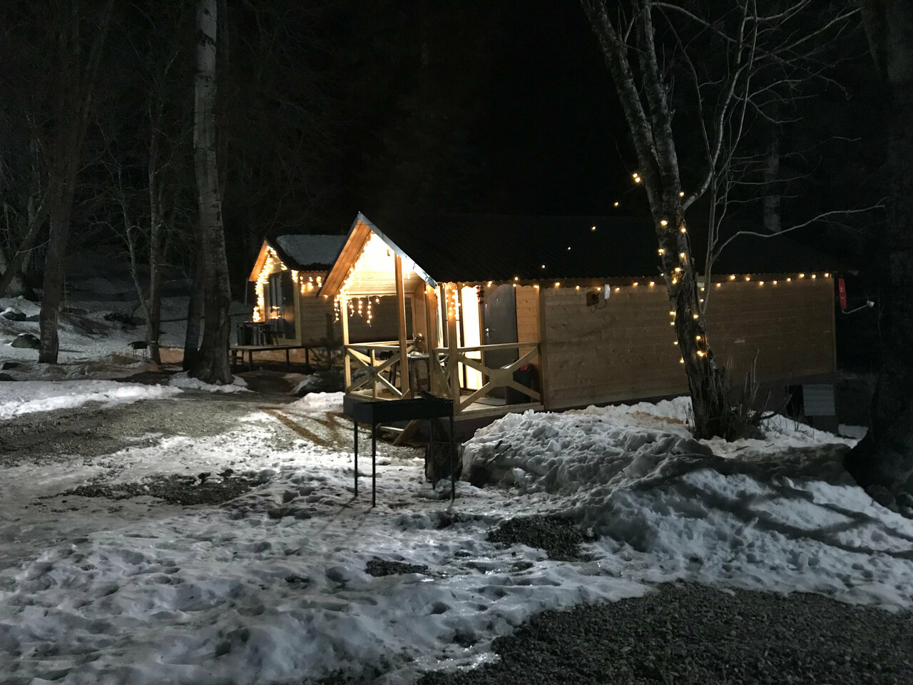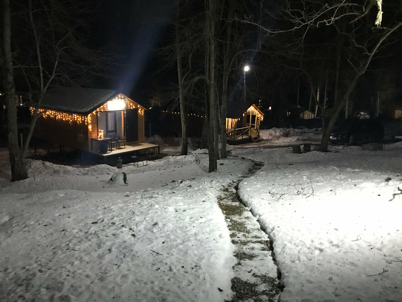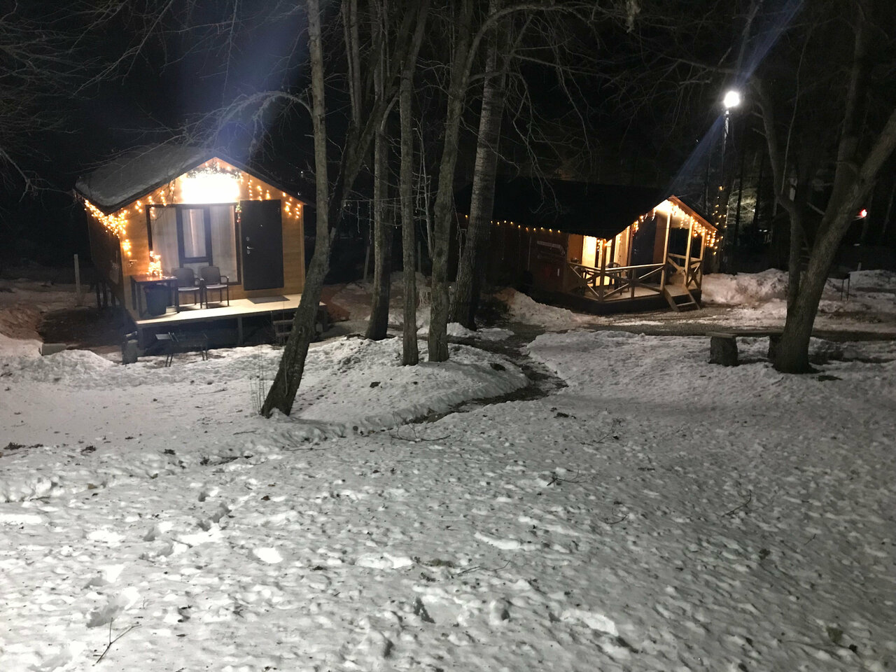Отличное место. Радушные хозяева. Всё новое, чистое. В лесу. Немного скользко зимой, добираться до домиков. Внутри сами домики маленькие, но уютные, новая мебель, телевизор, холодильник, санузел, душевые. Есть мангал и дрова
