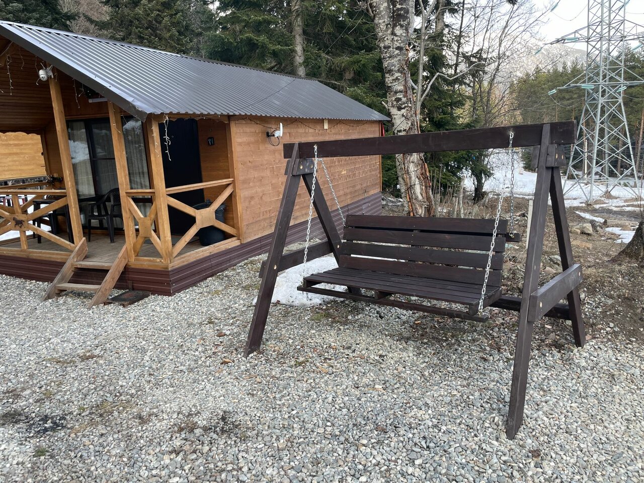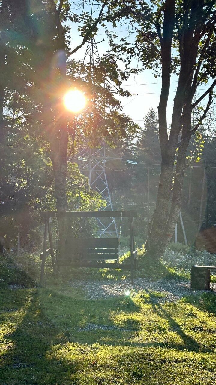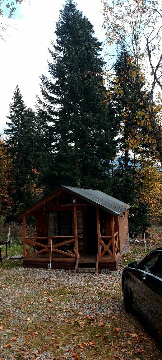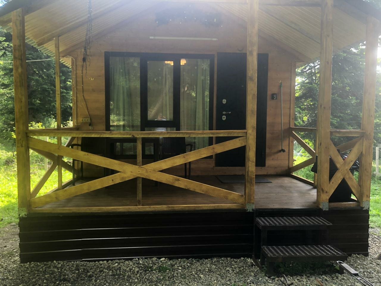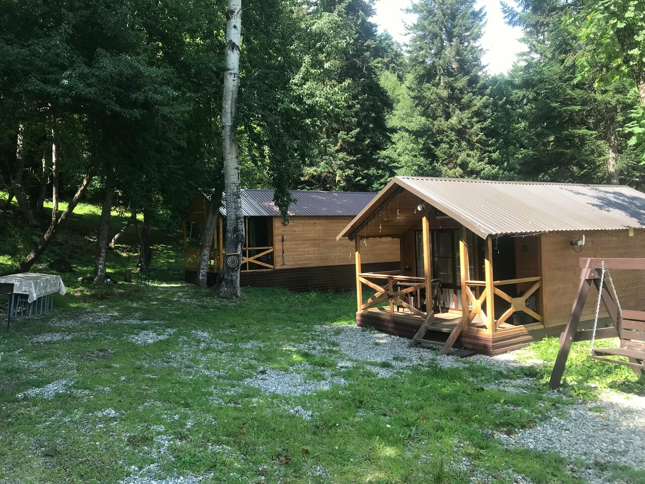 Домики находятся на отшибе в лесу. Не переживаешь, что можешь кого-то потревожить или потревожат тебя. Тихо, чисто, красиво. С веранды открывается вид на горы и лес, поют птички. Домики небольшие и теплые, есть все необходимое. У каждого домика есть своя мангальная зона, две качели и беседка.