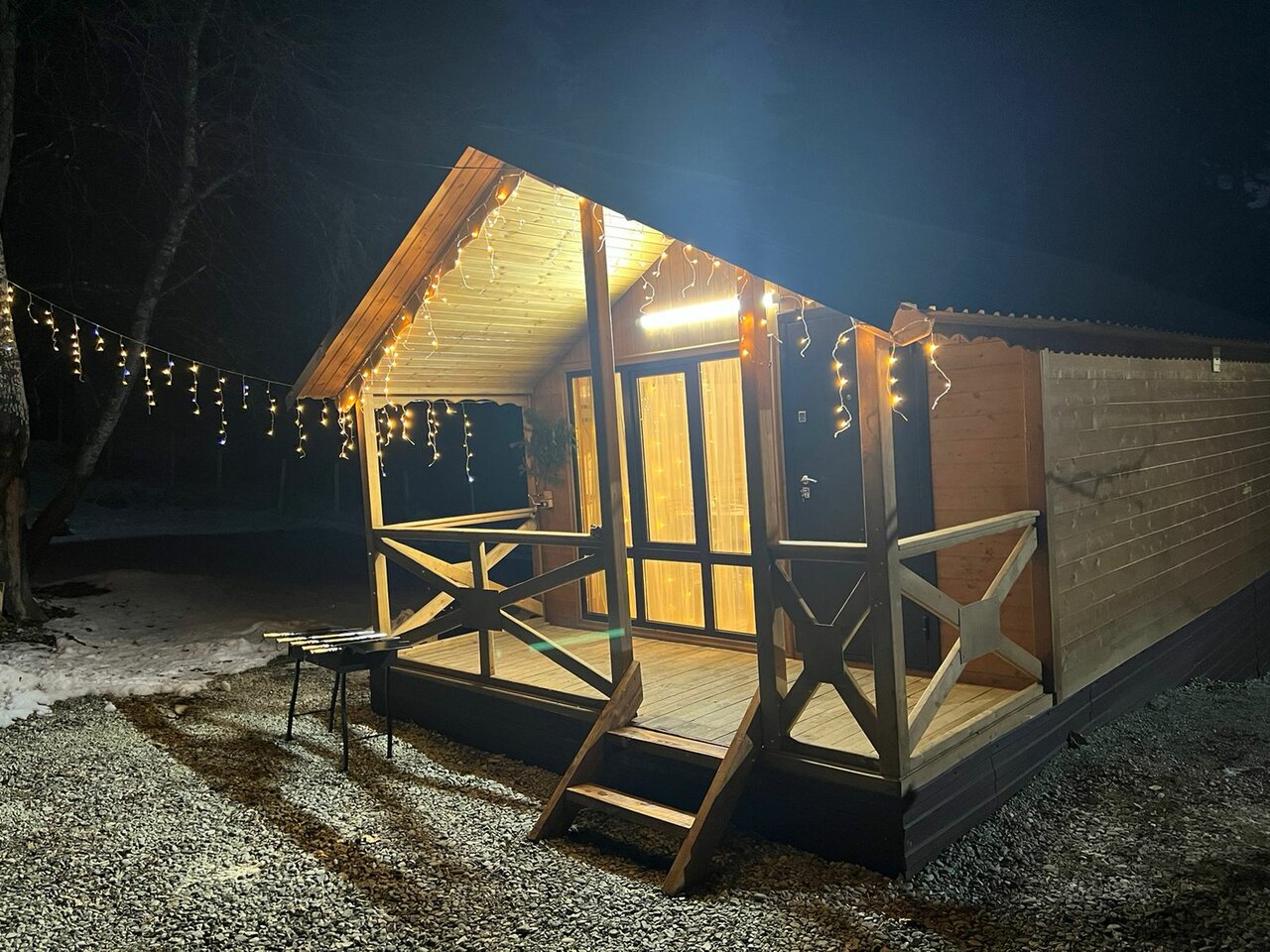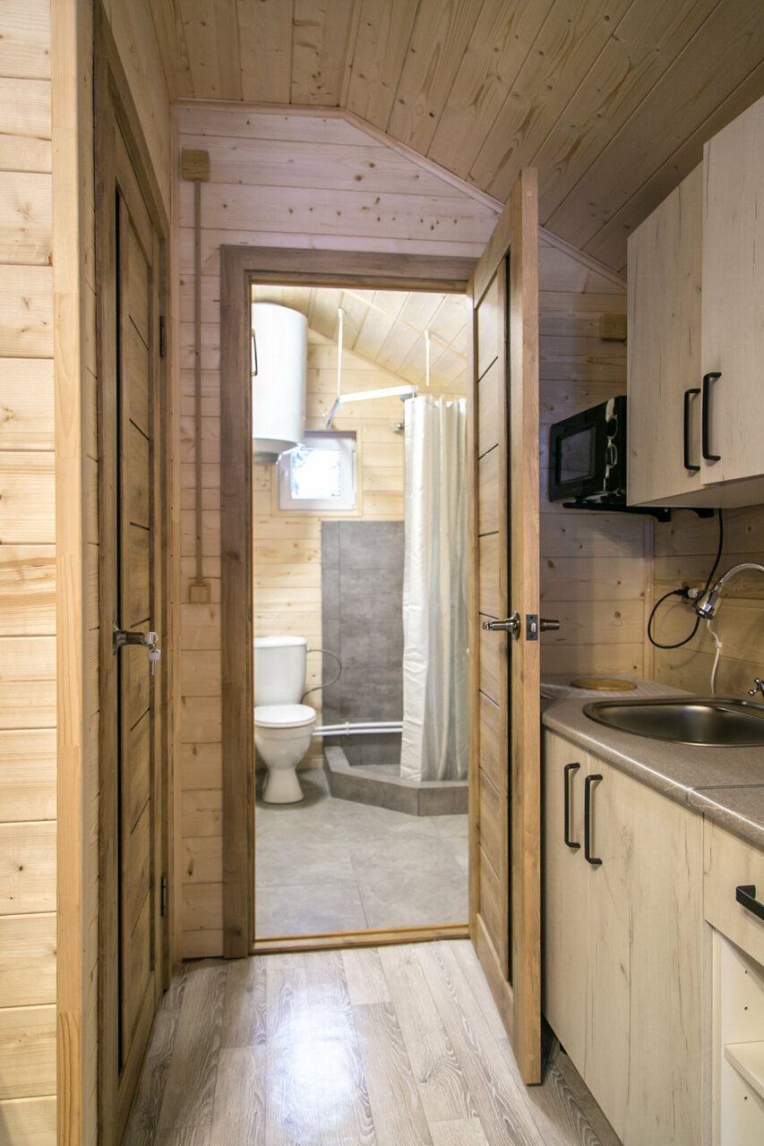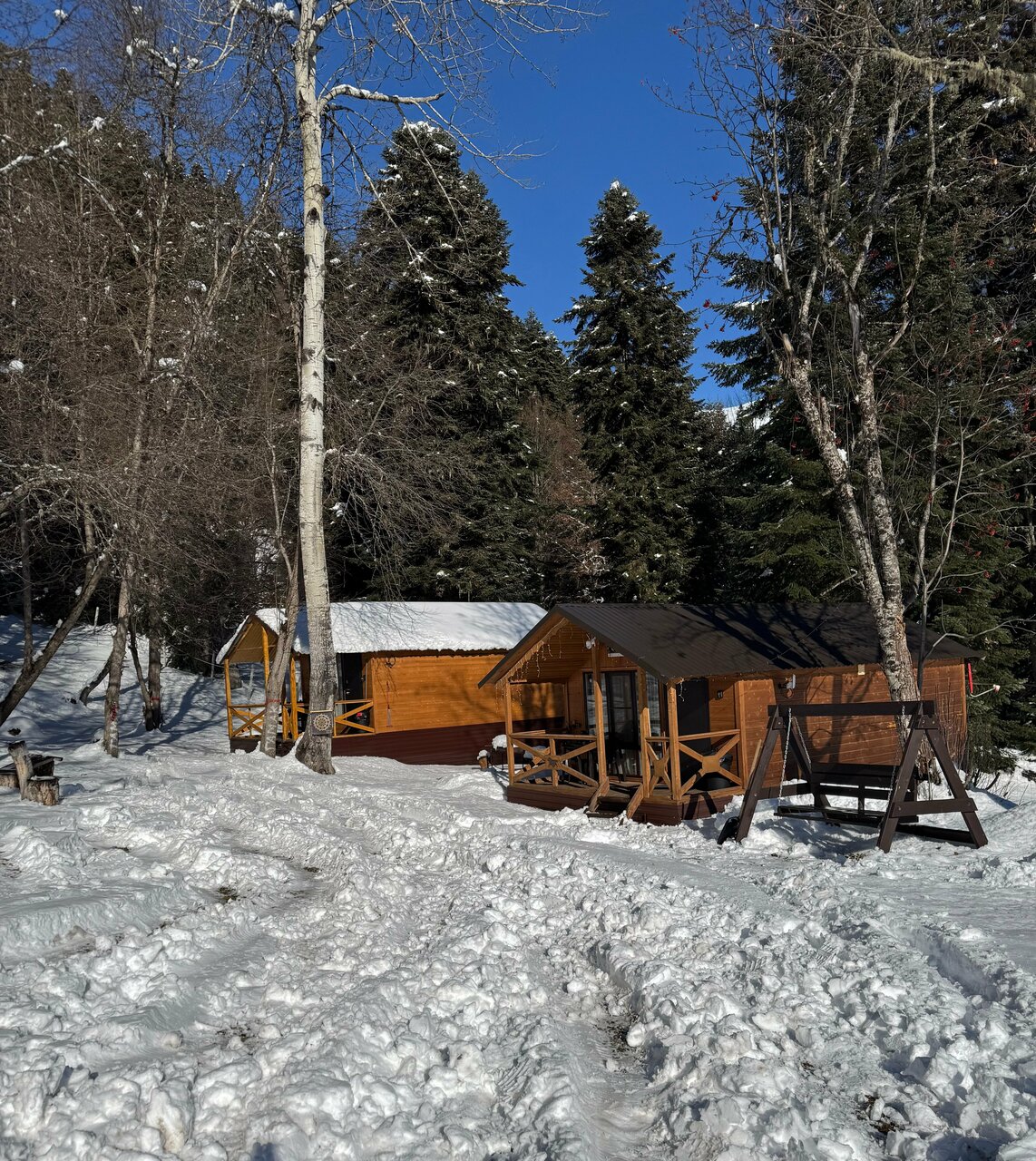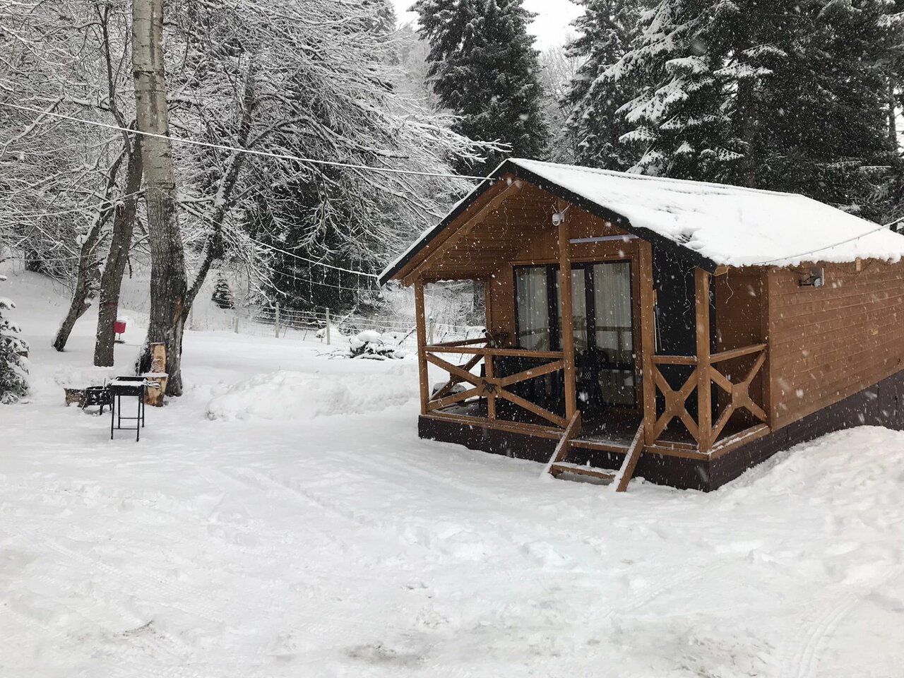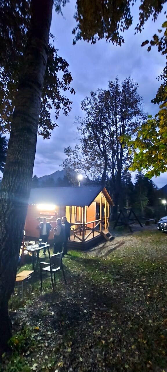 Домики находятся на отшибе в лесу. Не переживаешь, что можешь кого-то потревожить или потревожат тебя. Тихо, чисто, красиво. С веранды открывается вид на горы и лес, поют птички. Домики небольшие и теплые, есть все необходимое. У каждого домика есть своя мангальная зона, две качели и беседка.