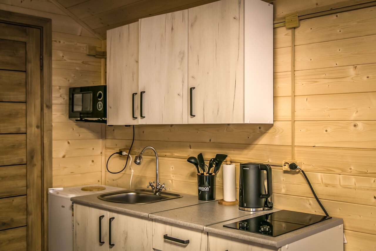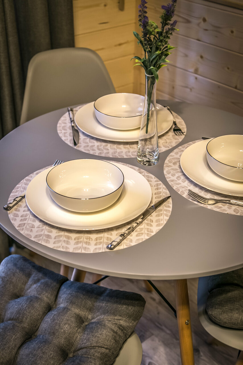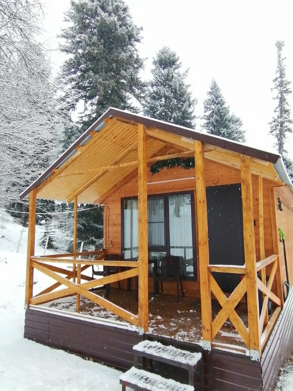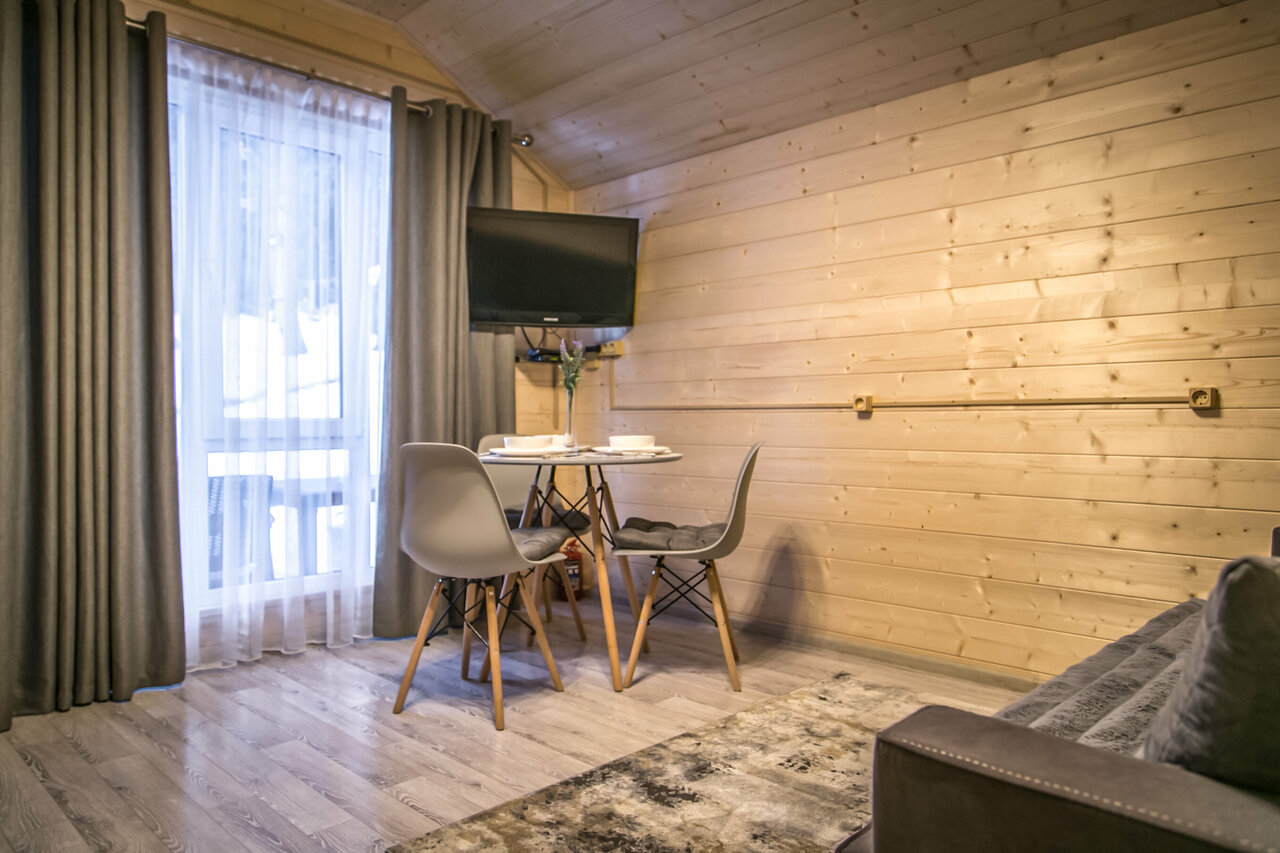 Домики находятся на отшибе в лесу. Не переживаешь, что можешь кого-то потревожить или потревожат тебя. Тихо, чисто, красиво. С веранды открывается вид на горы и лес, поют птички. Домики небольшие и теплые, есть все необходимое. У каждого домика есть своя мангальная зона, две качели и беседка.